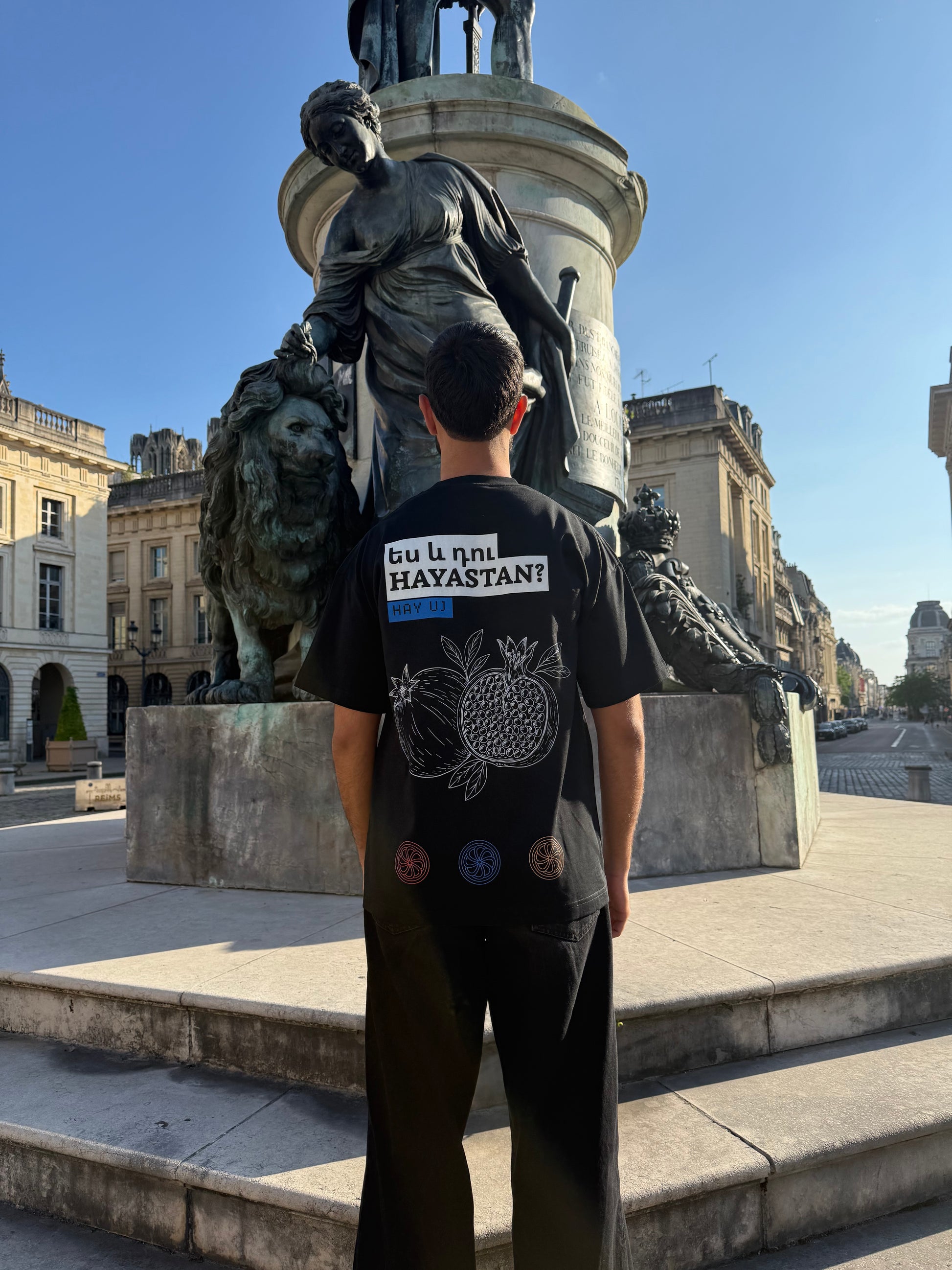 T-shirt “Hayastan” – Oversize et mixte, avec “Yes ev du” en lettres arméniennes et “Hayastan”, signifiant “Toi et moi, Arménie ?”. Le t-shirt intègre également une grenade, symbole de fertilité, et le symbole arménien de l’éternité et de la force.