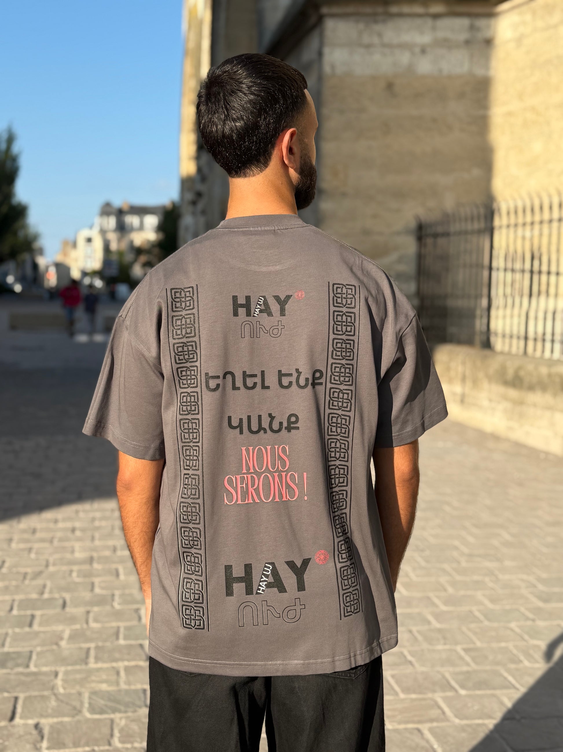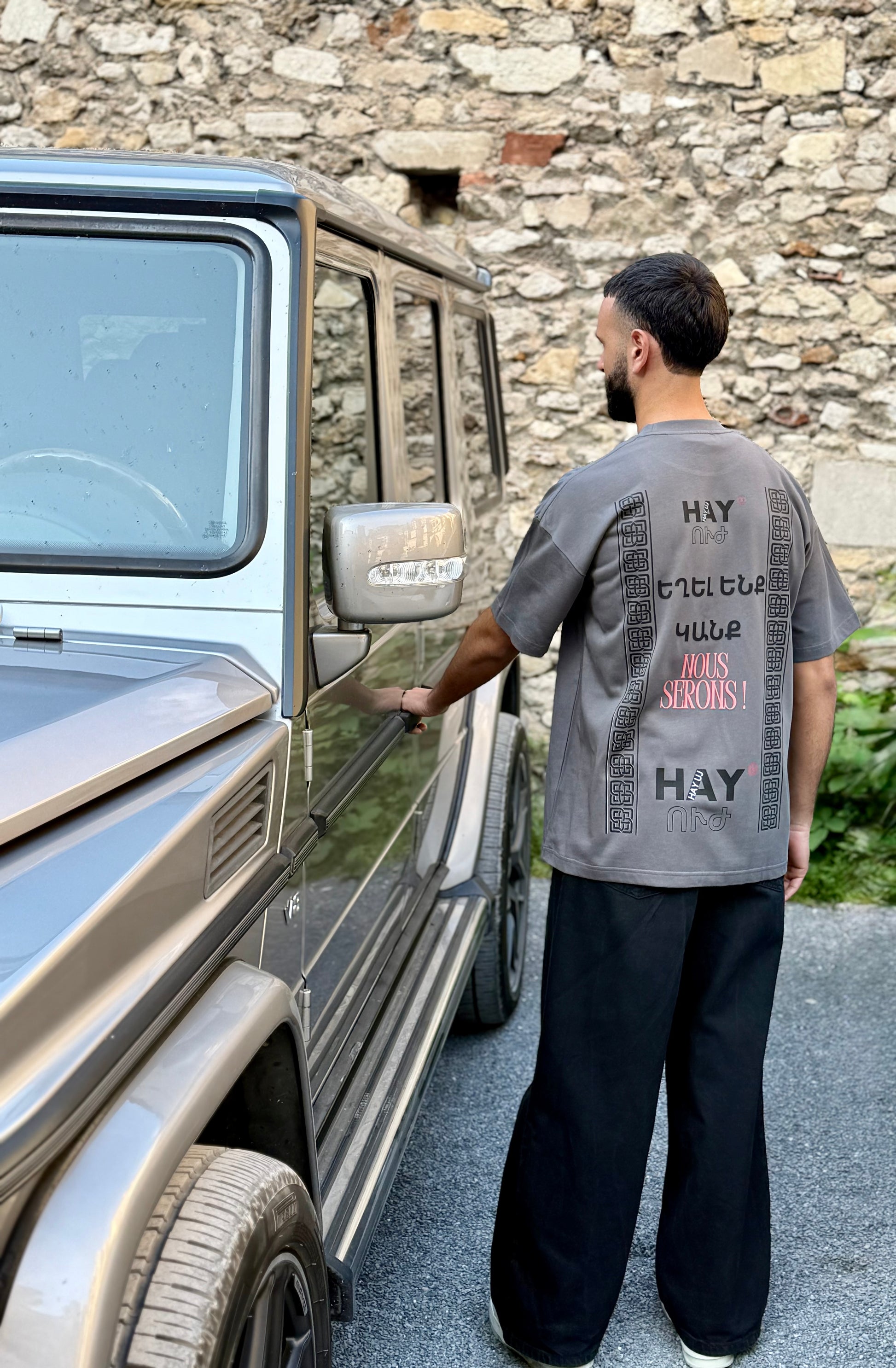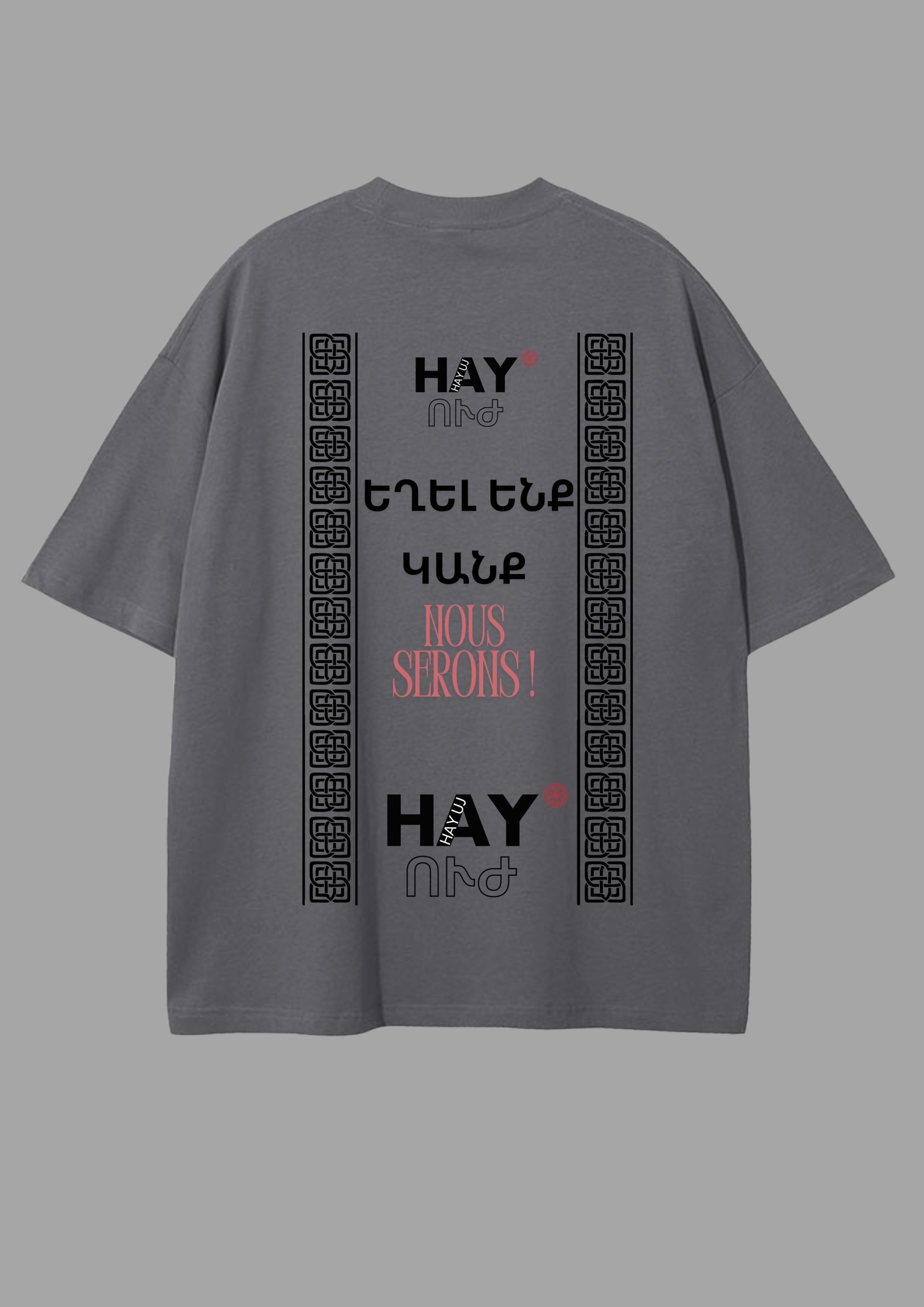 T-shirt “Kank” – Oversize et mixte, avec “Yerelenk Kank” en lettres arméniennes et “Nous serons” dans le dos, inspiré de la phrase arménienne “Yerelenk Kank Klinenk”, signifiant “Nous étions, nous sommes et nous serons”. Le t-shirt intègre également un des motifs traditionnels des tapis arméniens.
